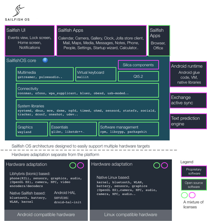 A diagram of the mix of open and closed software is here: https://2.bp.blogspot.com/-FbfD5dlCtEA/VtYez7UFDHI/AAAAAAAAA3g/1XByZOdCKYY/s1600/Sailfish_Architecture%255B1%255D.jpg [blogspot.com] (I can't find it on the officla pages right now)