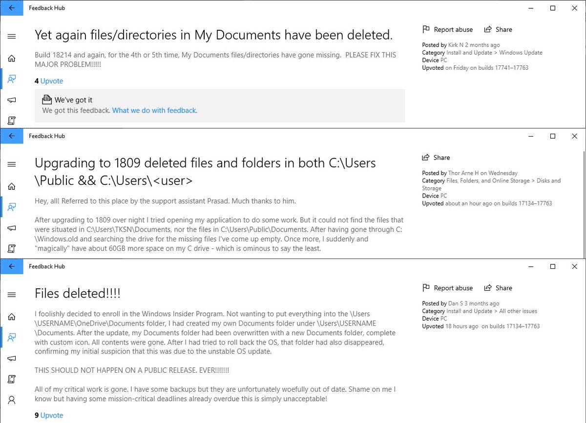That story references this Tweet [twitter.com] which shows what appears to be a screen grab of several bug reports on Feedback Hub. Direct link to images are image #1 [twimg.com] and image #2 [twimg.com].