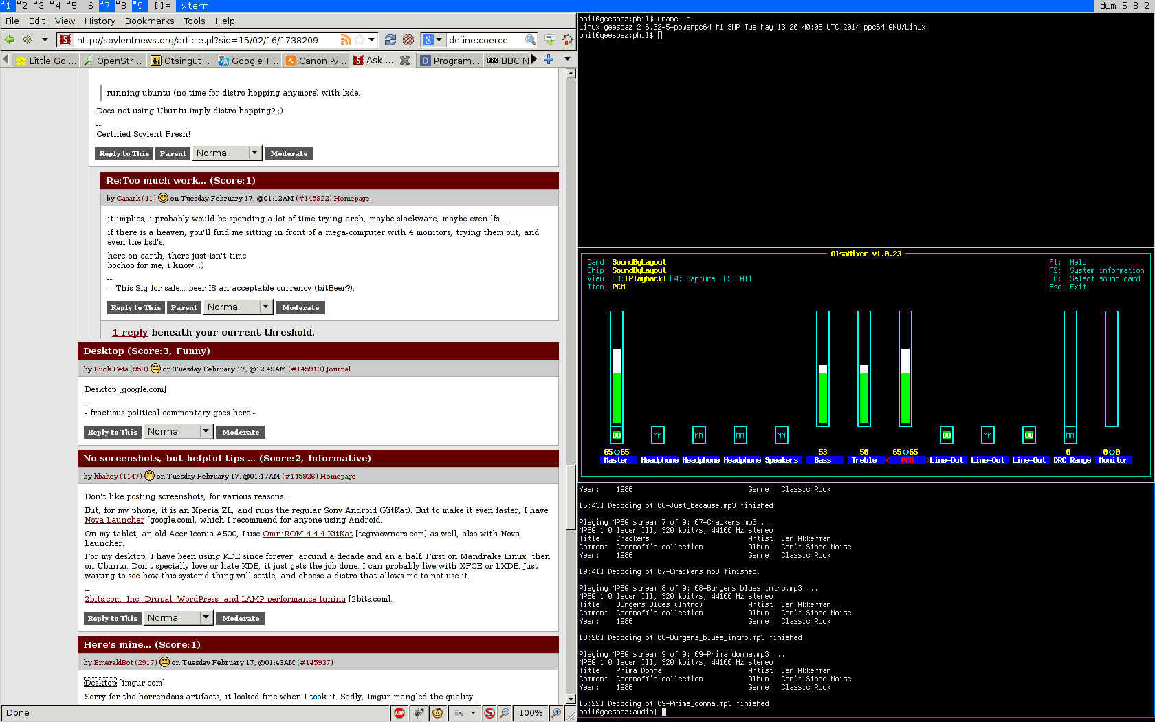 I thought it this would be fun everybody. I thought it might be interesting to compare desktop screenshots and see what other SoylentNews user interfaces look like. Tiling window manager or stacking? Desktop environment or not? Are you minimalist? What operating systems are you using?