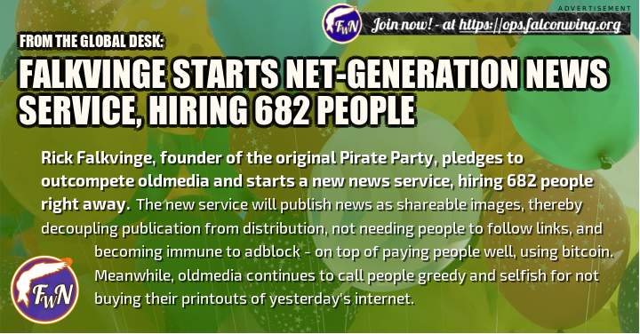Former Swedish Pirate Party leader and Internet activist Rick Falkvinge launched a new venture yesterday. Intended to rival established media, Falconwings provisions quality news bulletins that are easily shared via the project's automated image creation process. A total of 600 writers are being recruited, with the sole criteria being the ability to consistently author summaries of 450 characters, split into three principle sentences: Fact, Background and Satire.