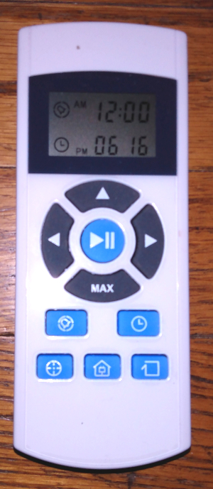 The remote, pictured, has a “home” button in the center, at the bottom, that sends it back to its charging base. It returns to its base by itself when it’s finished sweeping or the battery gets low.