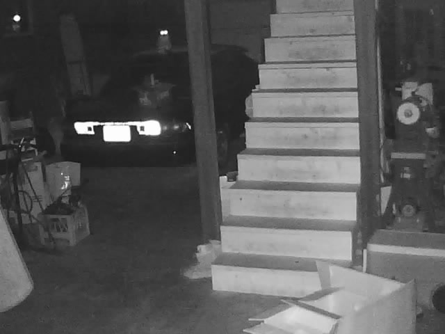 I wanted to get an outdoor WIFI infrared camera next, and I couldn't find a cheap one at my wholesaler, so I bought a Security Labs SLW-164. I think it cost about $220. I don't recommend this camera for 2 reasons. First, it's infrared seems very weak. Second, the camera's lens is much more narrow angle than the TrendNet models. Compare these 2 pictures taken side-by-side in my pitch-black basement using the IP551WI and SLW-164. In the SLW pic you can barely make out the license plate of the car, but the IP551 brightly illuminates the entire half of my basement (the distance from the camera to the door in front of the car is about 40 feet). Notice the cat sitting on top of the car, eyes glowing. Not even visible in the SLW picture!