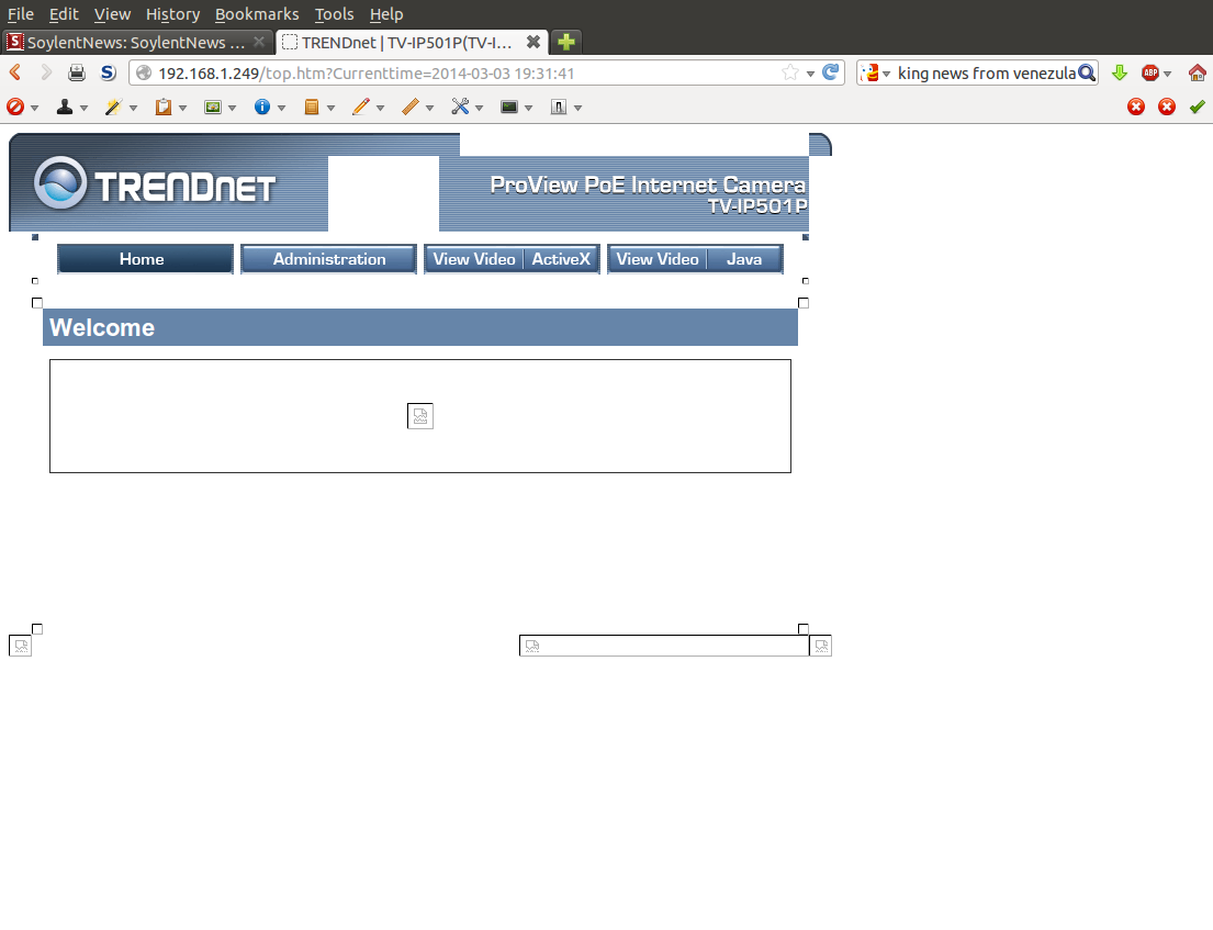 The first camera I tried was an old TrendNet IP501P. It's a POE (power-over-ethernet) model and has a low-profile design that would be perfect for an enclosure to use outside, but since it doesn't have infrared I decided to just put it in the window and point it at my barn. This camera is quite old (I don't remember when I bought it, perhaps 5 years ago?) and its firmware is not that great. Many times when the admin interface comes up it looks like it's having difficulty displaying all the images, links, etc. I made sure it had the latest firmware installed and it didn't fix the problem. No worries, though because I'll just be pulling a static image and that seems to work OK. The electrical tape covers the power and activity lights that cause a reflection when it's put near a window.