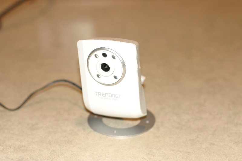After getting my code working and testing it for a couple of months, I invested in 2 WIFI infrared cameras. The TrendNet IP551WI cost about $60 from my wholesaler, and it uses basic authentication just like the IP501P. It has a wide-angle lens that can be focused, and the infrared illuminates a very dark area quite well. It also has an auto-sensor (at the top between the 2 IR lights) that toggles the IR off when the light is adequate and on when it's too dark.
